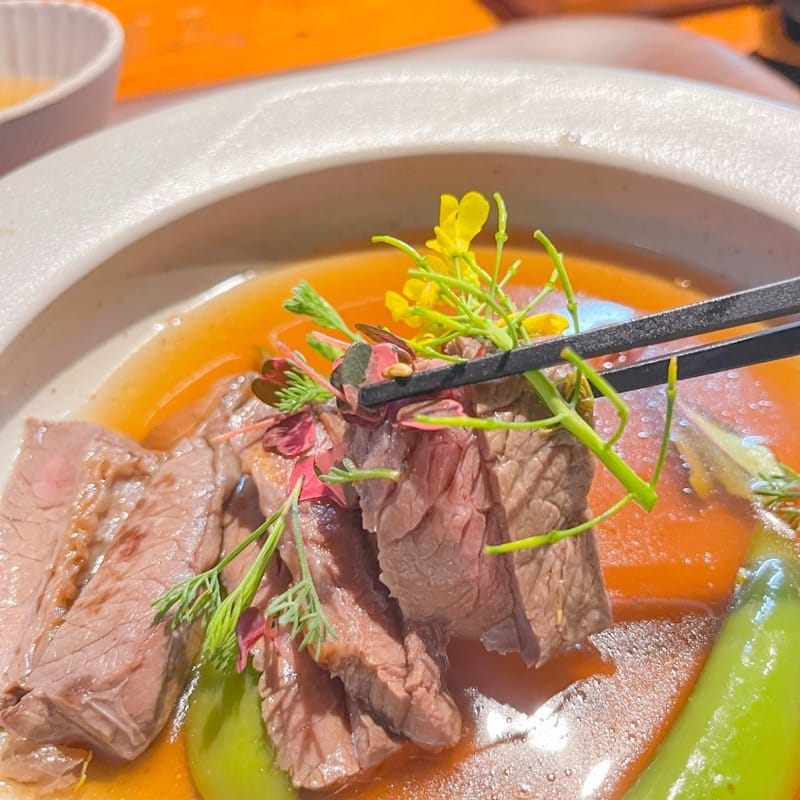 上品なお出汁の中に盛り付けられた、美しいお肉。
