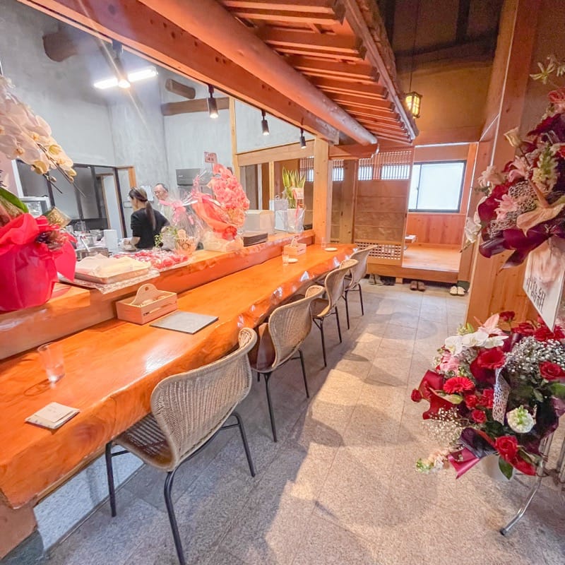 古民家の趣を活かした店内へ入ると、まず目に飛び込んでくるのは重厚な一枚板を用いたカウンター席。