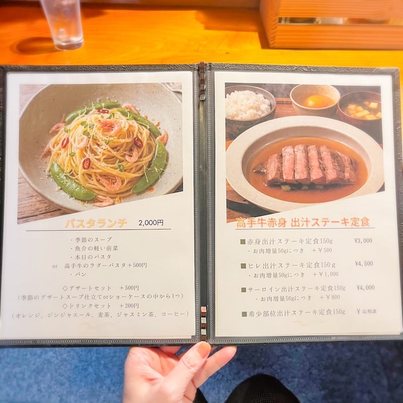 お食事のメニューは、パスタランチと「高手牛赤身出汁ステーキ定食」の2種類。