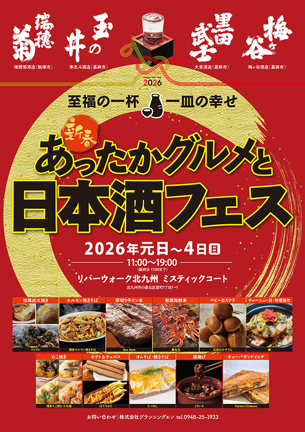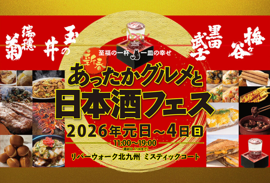 2026年1月1日(元日)~4日(日)、リバーウォーク北九州のミスティックコートにて「新春!あったかグルメと日本酒フェス」が開催されます!お正月は美味しい日本酒とあったかグルメを楽しもう。
