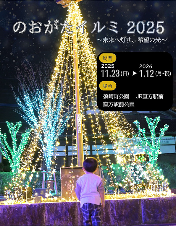 11月23日(日)、直方駅前須崎町公園で「のおがたイルミ2025~未来へ灯す、希望の光~」の点灯式が開催されます。今年で5回目を迎える「のおがたイルミ」は、今年も18万球の電飾が街を彩ります。テーマは「未来へ灯す、希望の光」。冬の夜を明るく照らす、心温まるイルミネーションが楽しめます。点灯期間は1月12日(月・祝)までで、会場は須崎町公園や直方駅前公園などに広がります。