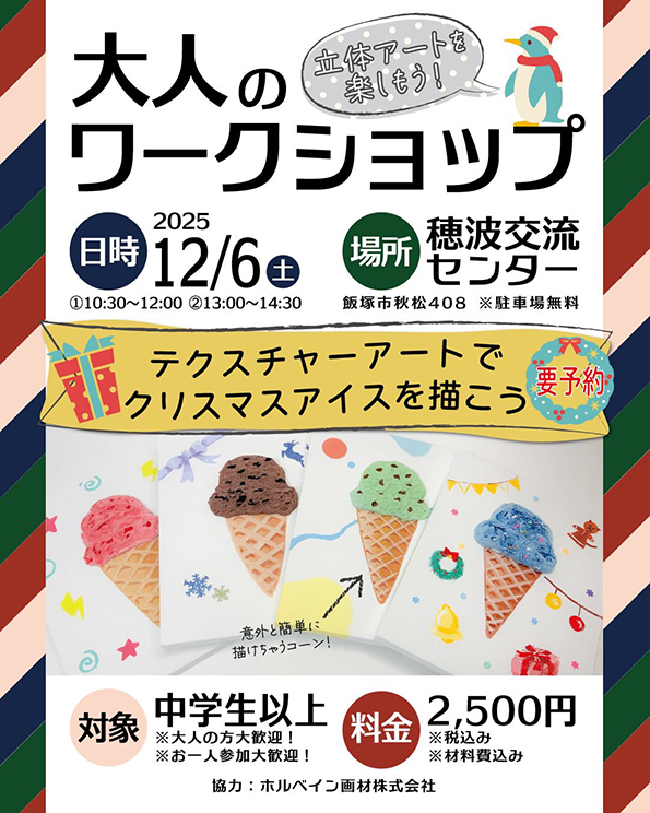 12月6日(土)、穂波交流センターで大人のワークショップ「テクスチャーアートでクリスマスアイスを描こう」が開催されます。