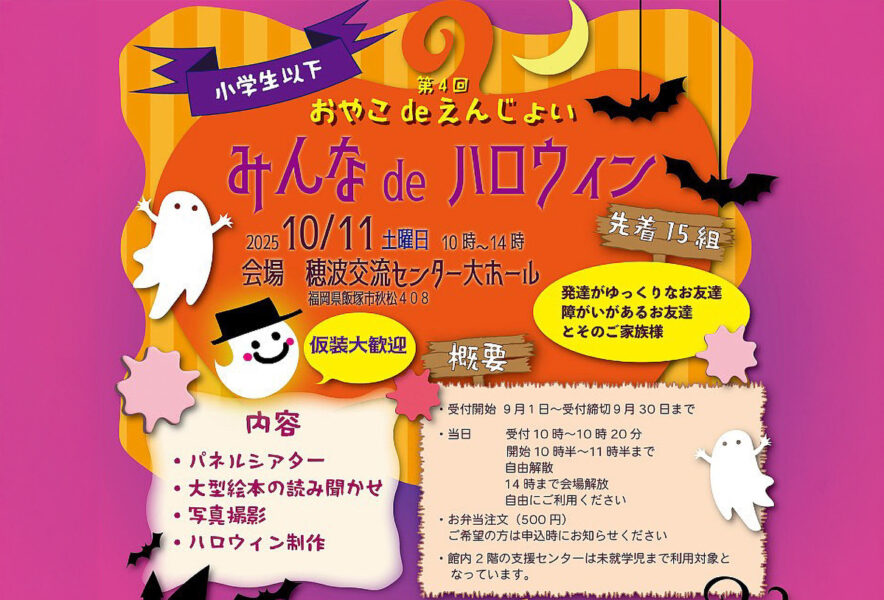 10月11日(土)、穂波交流センターで「第4回 おやこdeえんじょい みんなdeハロウィン」が開催されます。