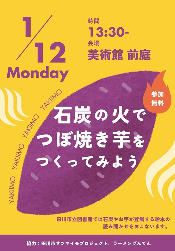 1月12日(月・祝)、田川市美術館で「石炭の火でつぼ焼き芋をつくってみよう」が開催されます。
