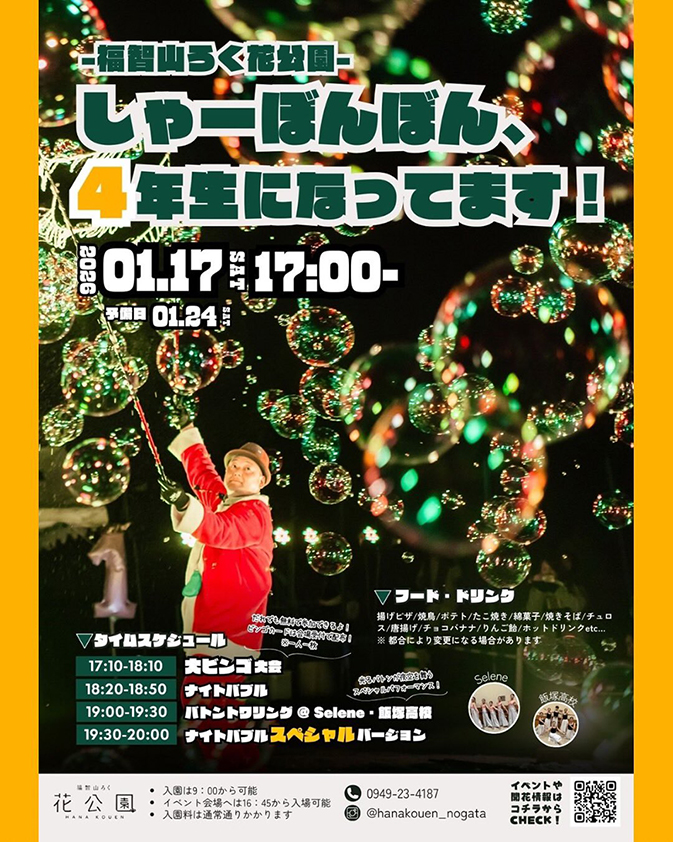 今回も、しゃーぼんぼんの仲間たちが大集合し、ステージイベントをはじめ、キッチンカーや縁日、ビンゴ大会など、楽しみが盛りだくさん!会場全体が一体となって盛り上がる、冬のナイトイベントです。