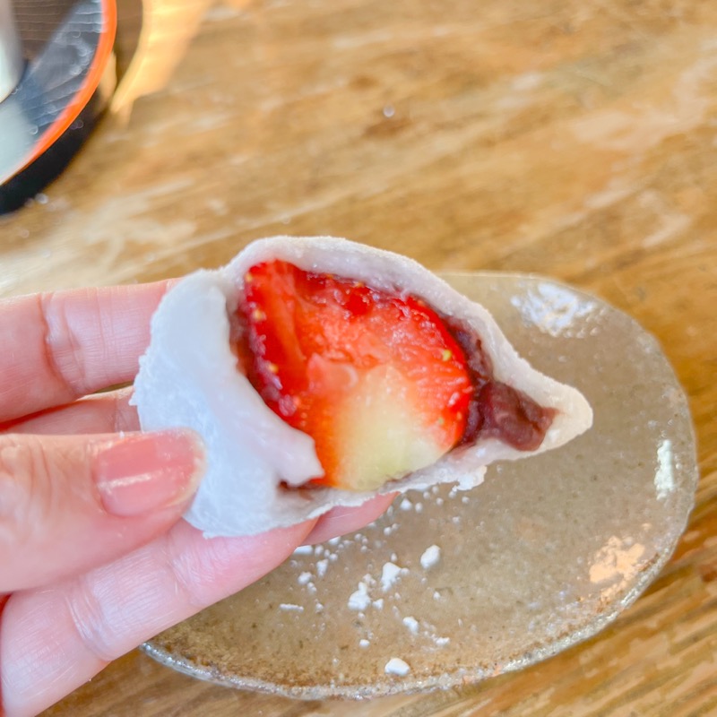 いちご大福を撮影用にカットしてもらいましたが、なんとも美しい断面!見るだけでいちごの新鮮さが伝わります。