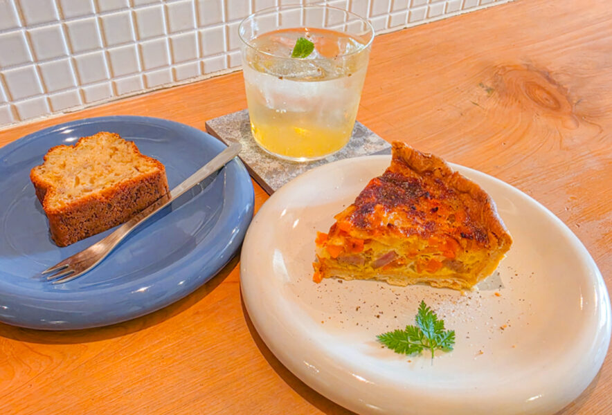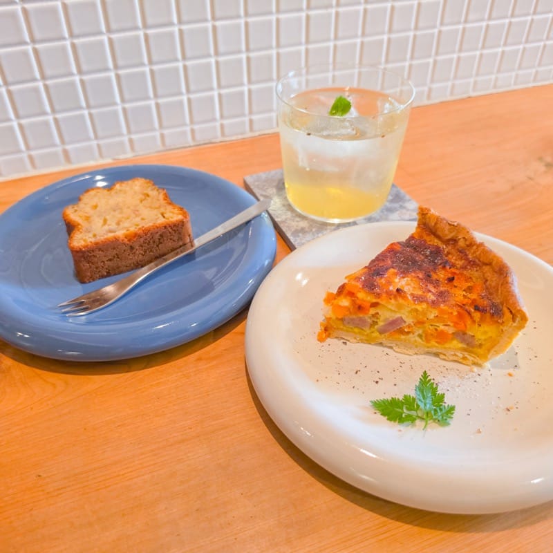 ジャスミンティーソーダ 500円・日替わりキッシュ(右)500円・バナナケーキ(左)350円