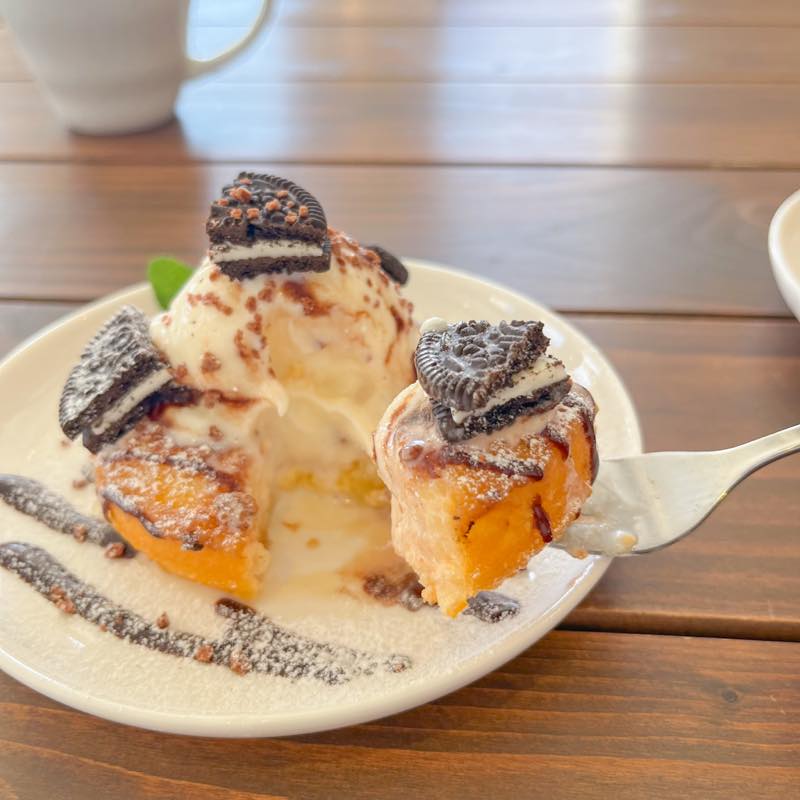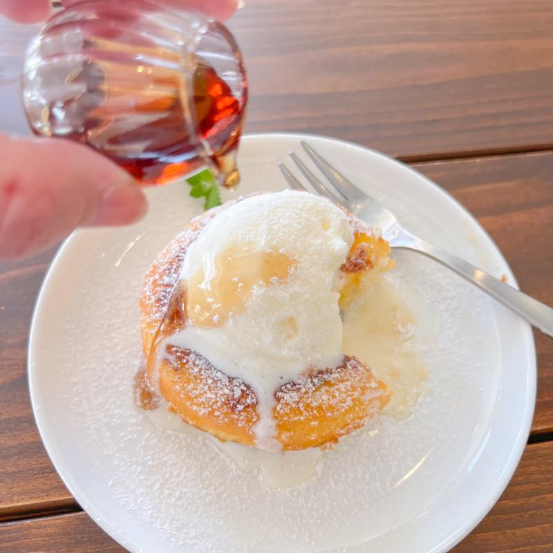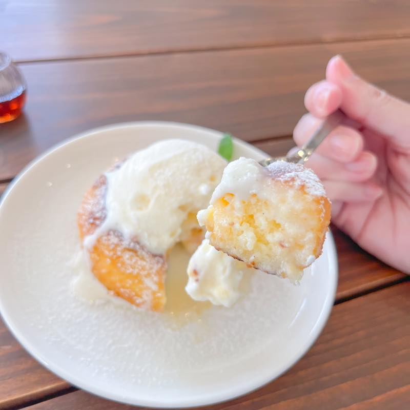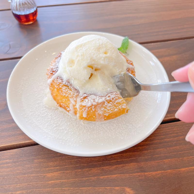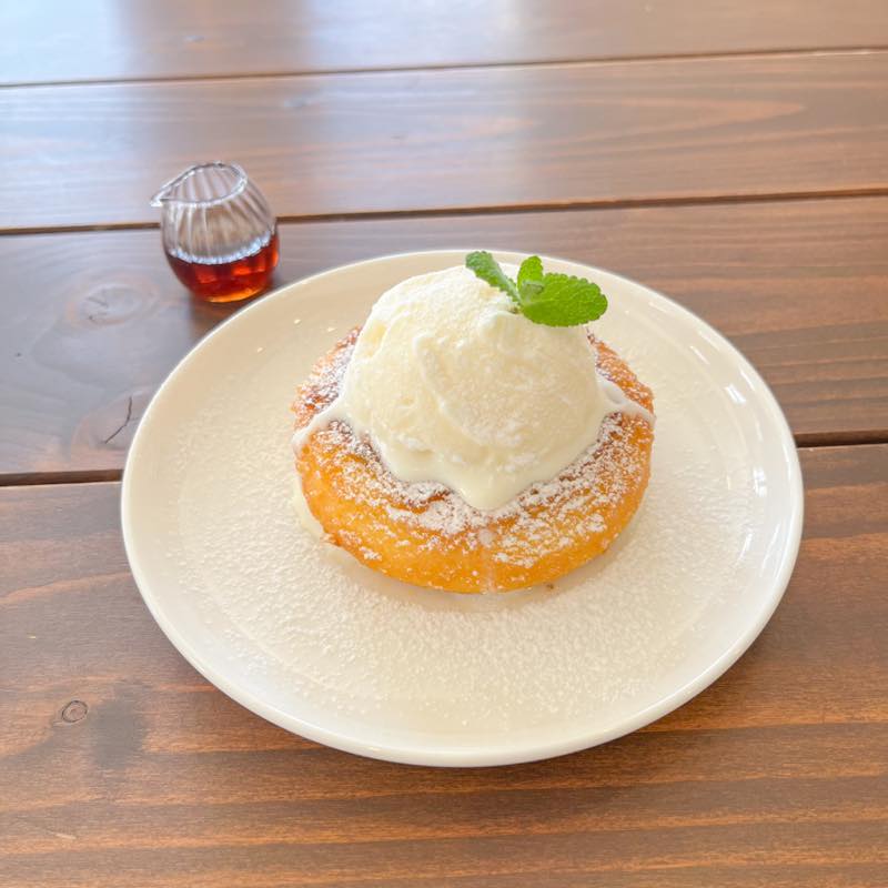 フレンチトースト風に焼かれた米粉ドーナツの上にジェラートがのっています。