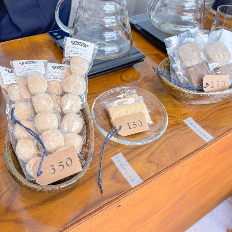 一緒に並んでいるのは、優しい味わいの米粉のお菓子たち。「身体にいいものを少しでも届けたい」というオーナーさんの想いから、TetoTeとsow.の米粉おやつを取り扱っているそう。