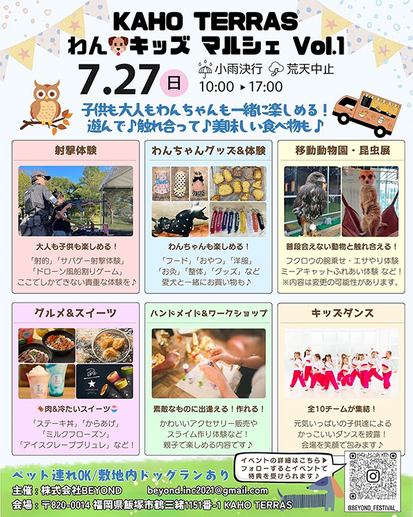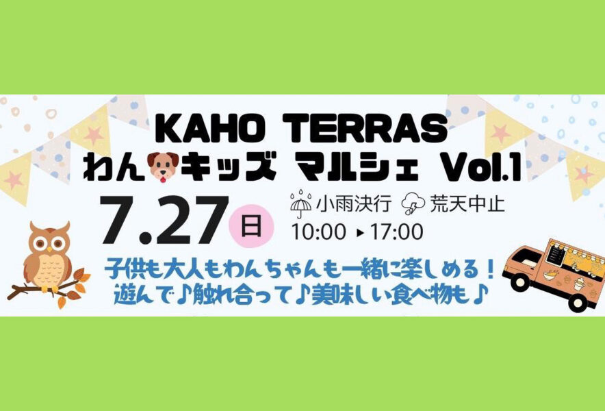 7月27日、カホテラスにて「KAHO TERRAS わん🐶キッズ マルシェ Vol.1」が開催されます。