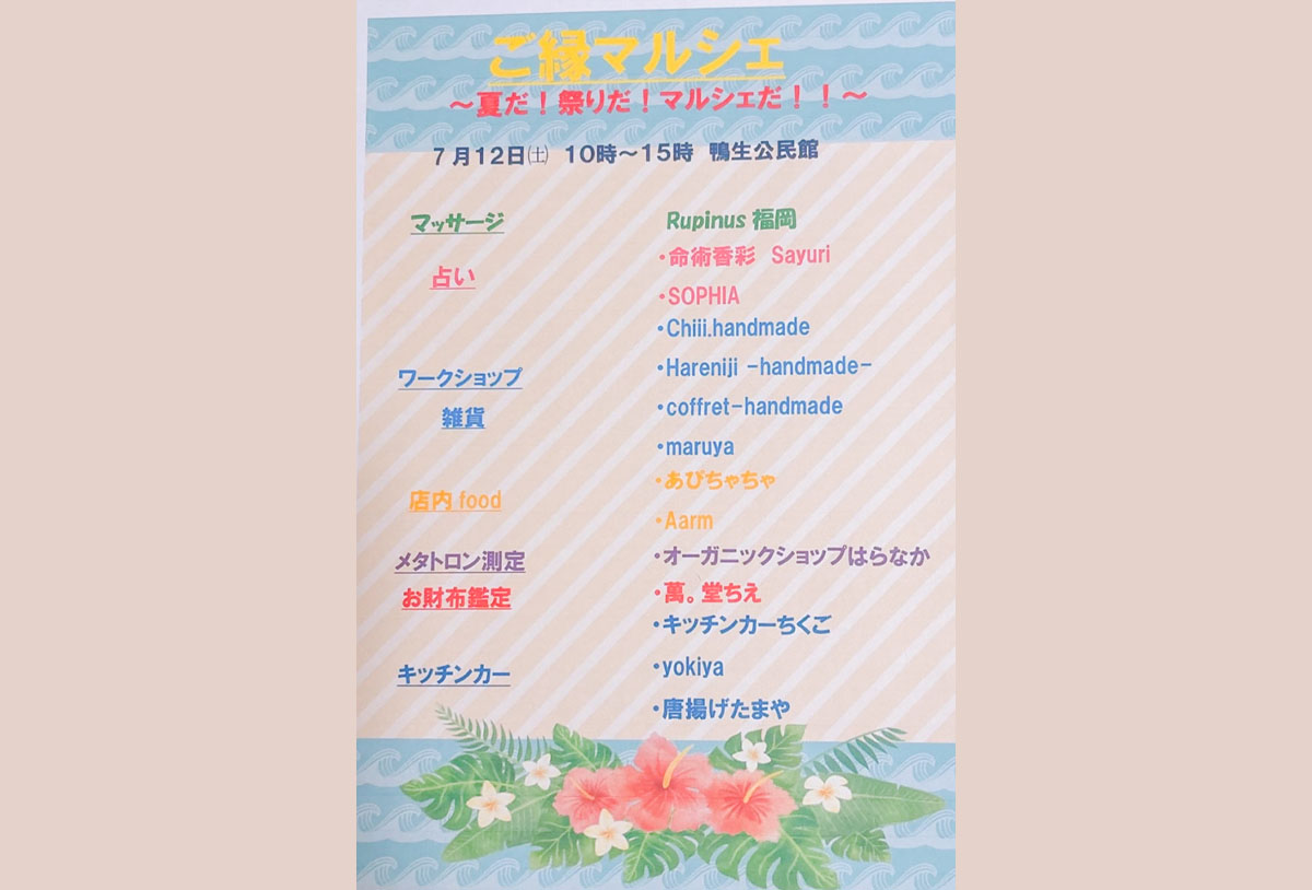 7月12日(土)、嘉麻市の鴨生公民館にて「ご縁マルシェ」が開催されます。