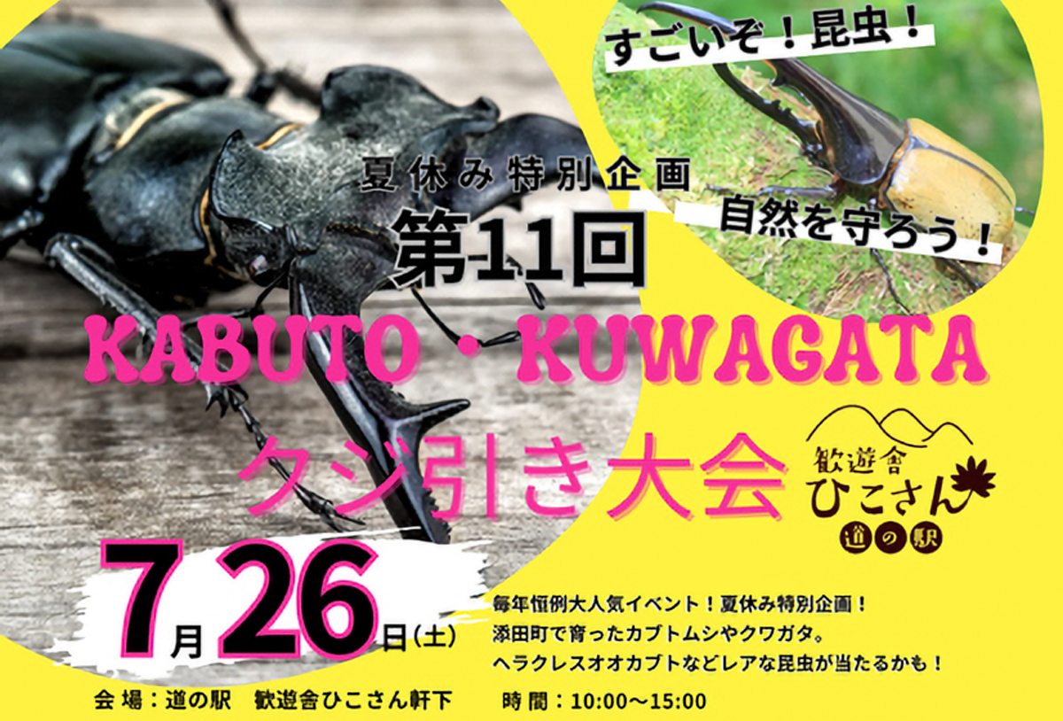 7月26日(土)、道の駅 歓遊舎ひこさんで「第11回 KABUTO・KUWAGATAクジ引き大会」が開催されます。