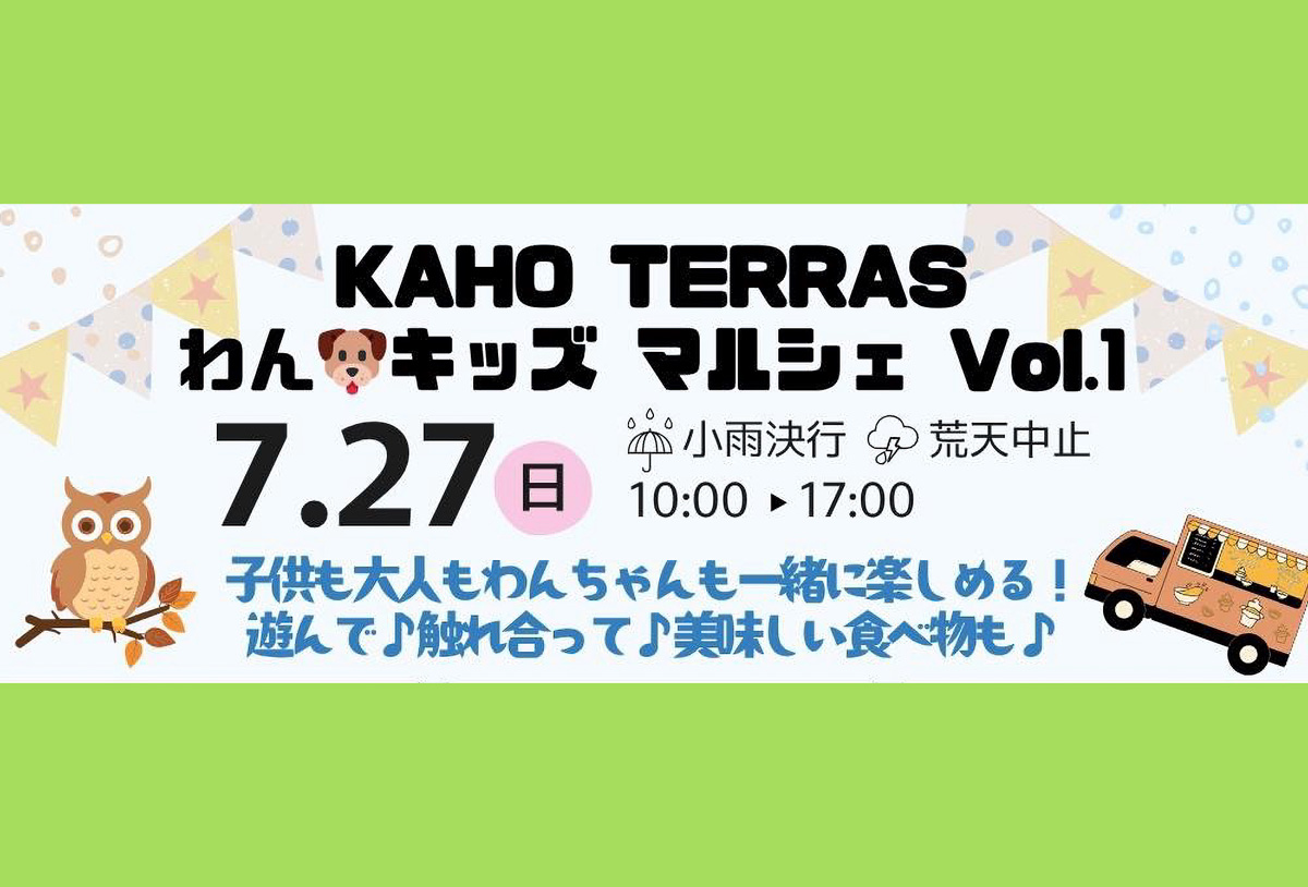 7月27日、カホテラスにて「KAHO TERRAS わん🐶キッズ マルシェ Vol.1」が開催されます。