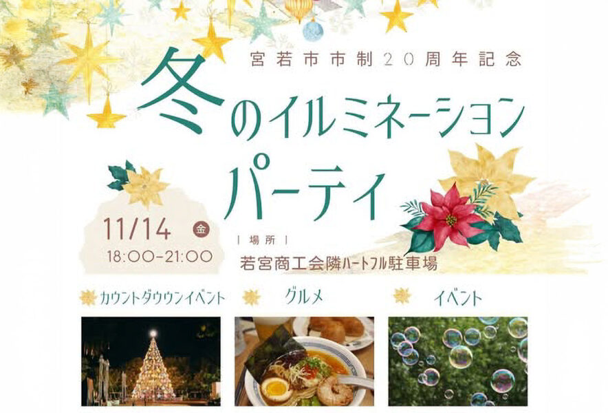 11月14日(金)、若宮コミュニティセンターハートフル駐車場で、宮若市市制20周年を記念して「冬のイルミネーションパーティ」が開催されます。